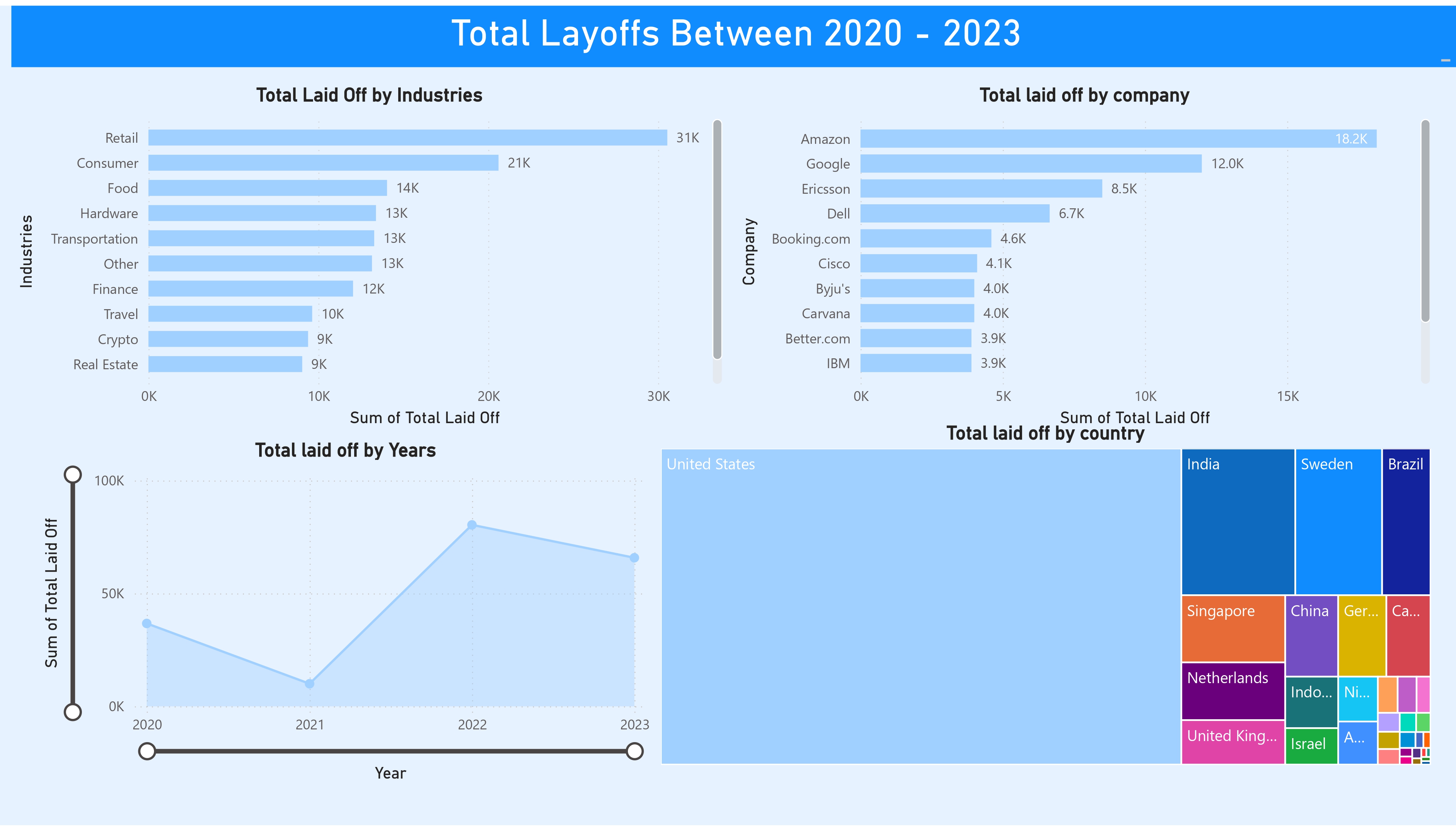 This project focuses on the data cleaning process of layoff data from 2020 to 2023. The cleaned data is visualized using Power BI to provide insights into trends and patterns, such as the industries most affected by layoffs, the geographical distribution of layoffs, and the timeline of layoff events. These insights help identify key factors contributing to workforce reductions and inform strategies for mitigating future layoffs.