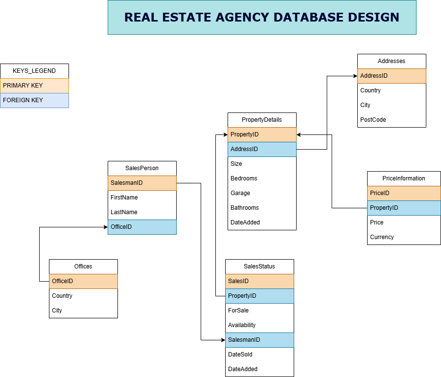 This project involves the design and implementation of a relational database system for a real estate agency operating across multiple cities and countries. The system effectively stores, manages, and analyzes data related to properties, locations, prices, availability statuses, and sales team transactions. Key features include tracking property listings (size, location, rooms), managing multiple office operations, monitoring property status, recording pricing history, assigning salespersons, and generating analytical reports using aggregate functions for business insights and performance evaluation.